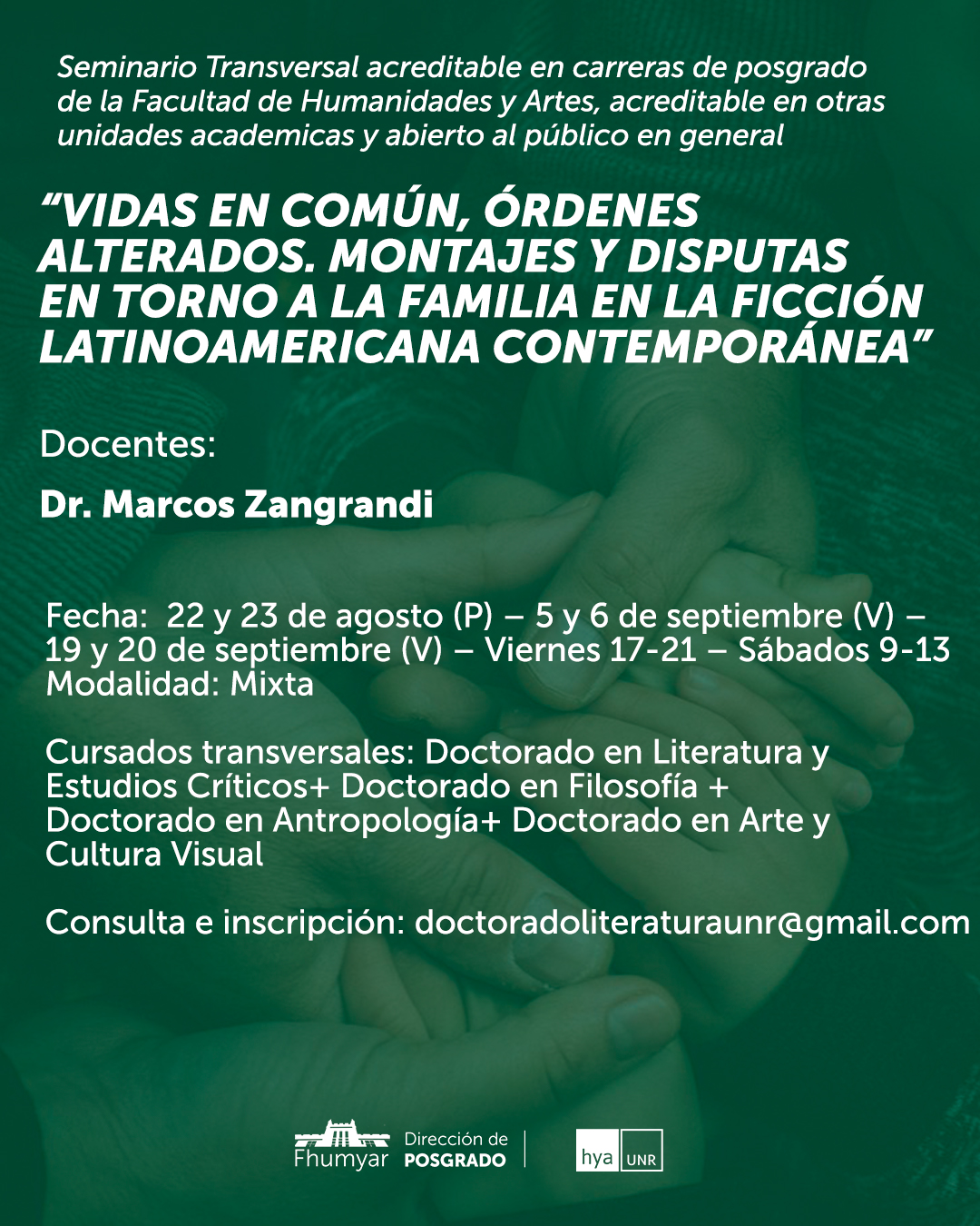 Sinopsis: En este seminario proponemos estudiar ficciones literarias y cinematográficas latinoamericanas sobre el linaje y la herencia, los lazos de pareja y los vínculos filiales, el entorno doméstico y los órdenes parentales, impactadas por teorizaciones y activismos de género y queer, por transformaciones políticas recientes en la región, y por narrativas reaccionarias que, en el presente, la reivindican como núcleo virtuoso del orden social. Se trata de películas, novelas y relatos contemporáneos en los que se leen disputas alrededor de disposiciones que, históricamente, orientaron las prácticas y los imaginarios domésticos, entre otros, el eje público/ privado, las pautas patriarcal, heterosexual, cis y binaria, y el mandato reproductivo.